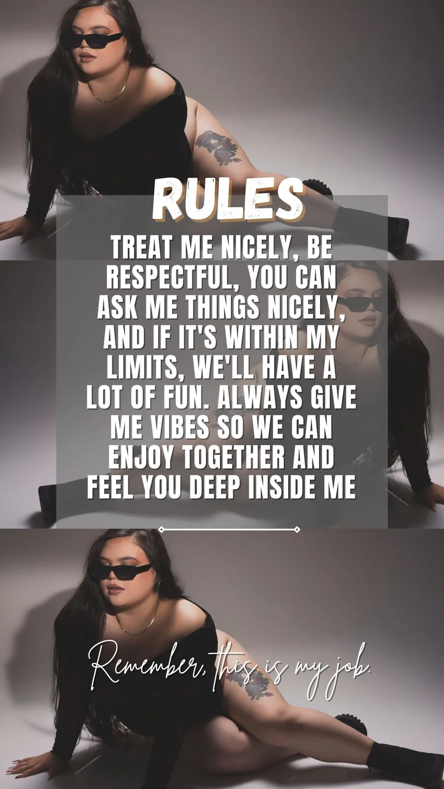 Trátame bien, sé respetuoso, puedes preguntarme cosas con amabilidad y, si está dentro de mis posibilidades, nos divertiremos mucho. Siempre quiero sentir buenas vibraciones para que disfrutemos juntos y sentirte profundamente dentro de mí.