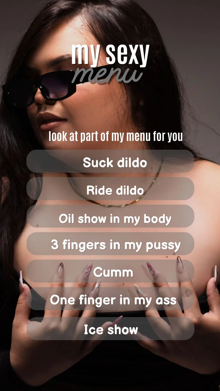 Ahegao, Anál, Bőr, Anális játékok, Nejlon, Magassarkú, Latex, Maszturbálás, Twerk, Kutyapóz, Fenekelés, Szopás, Orgazmus, Tevepata, Sztriptíz, Szexjátékok, Olajozás, Dildó vagy vibrátor, Ujjazás, Erotikus tánc, Jóga, Hardcore, Zuhany, Szájpecek, Mély torok, Lovaglás, Megalázás, Mocskos beszéd
